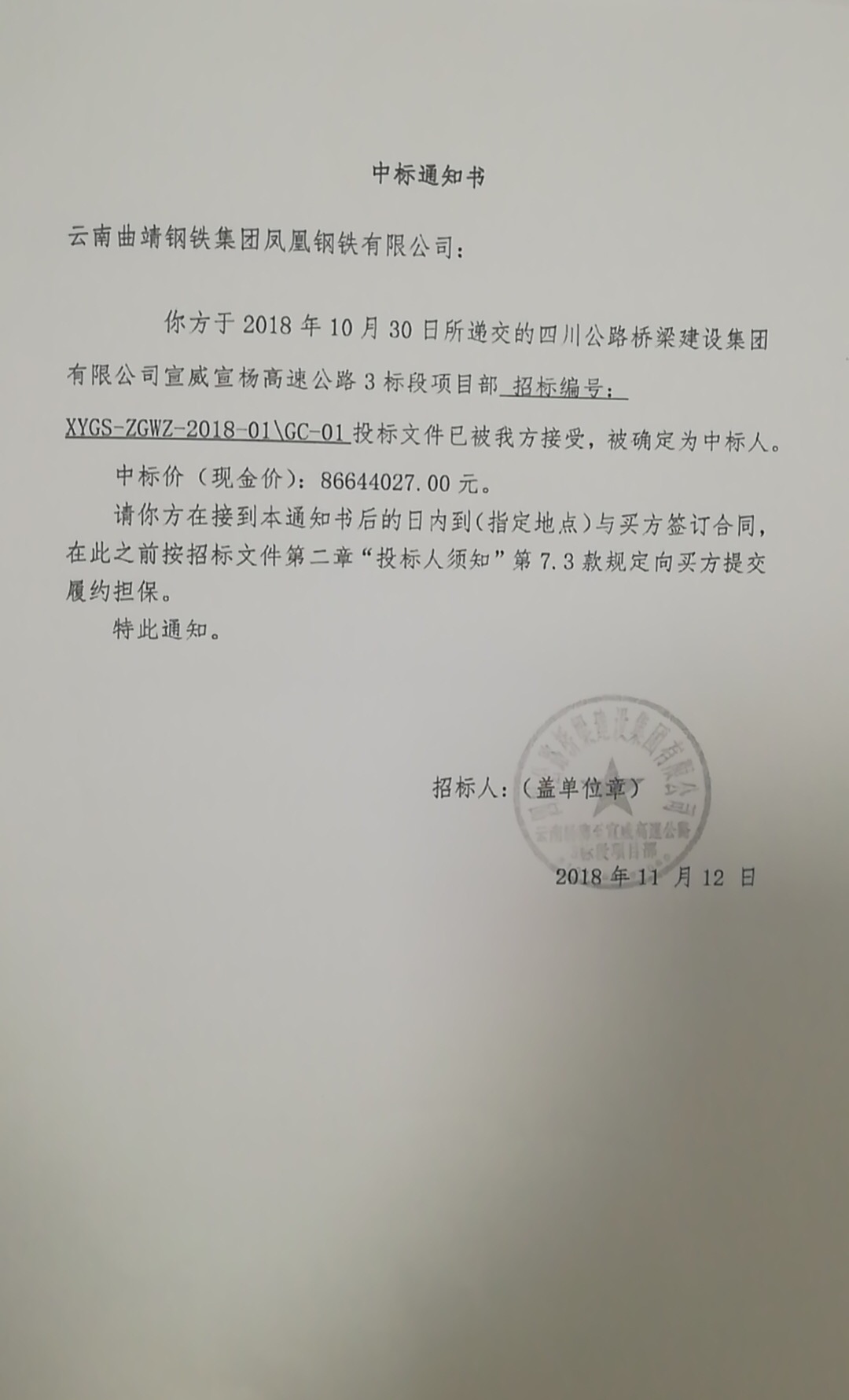 中標中鐵十八局安裝工程宣揚高速第二標段